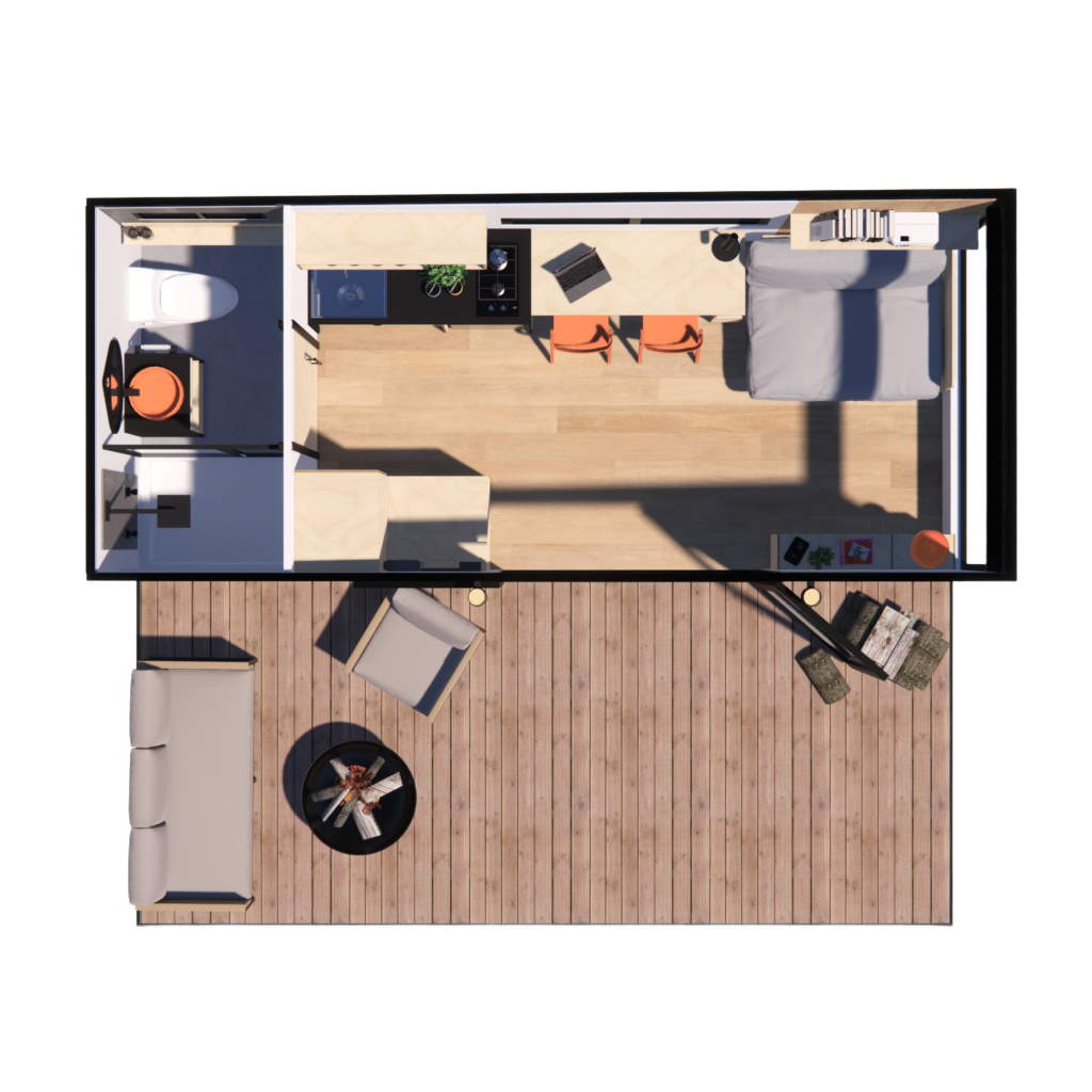 La versión más completa: cocina, lavandería, baño y dormitorio integrados en 15 m² de diseño de lujo.