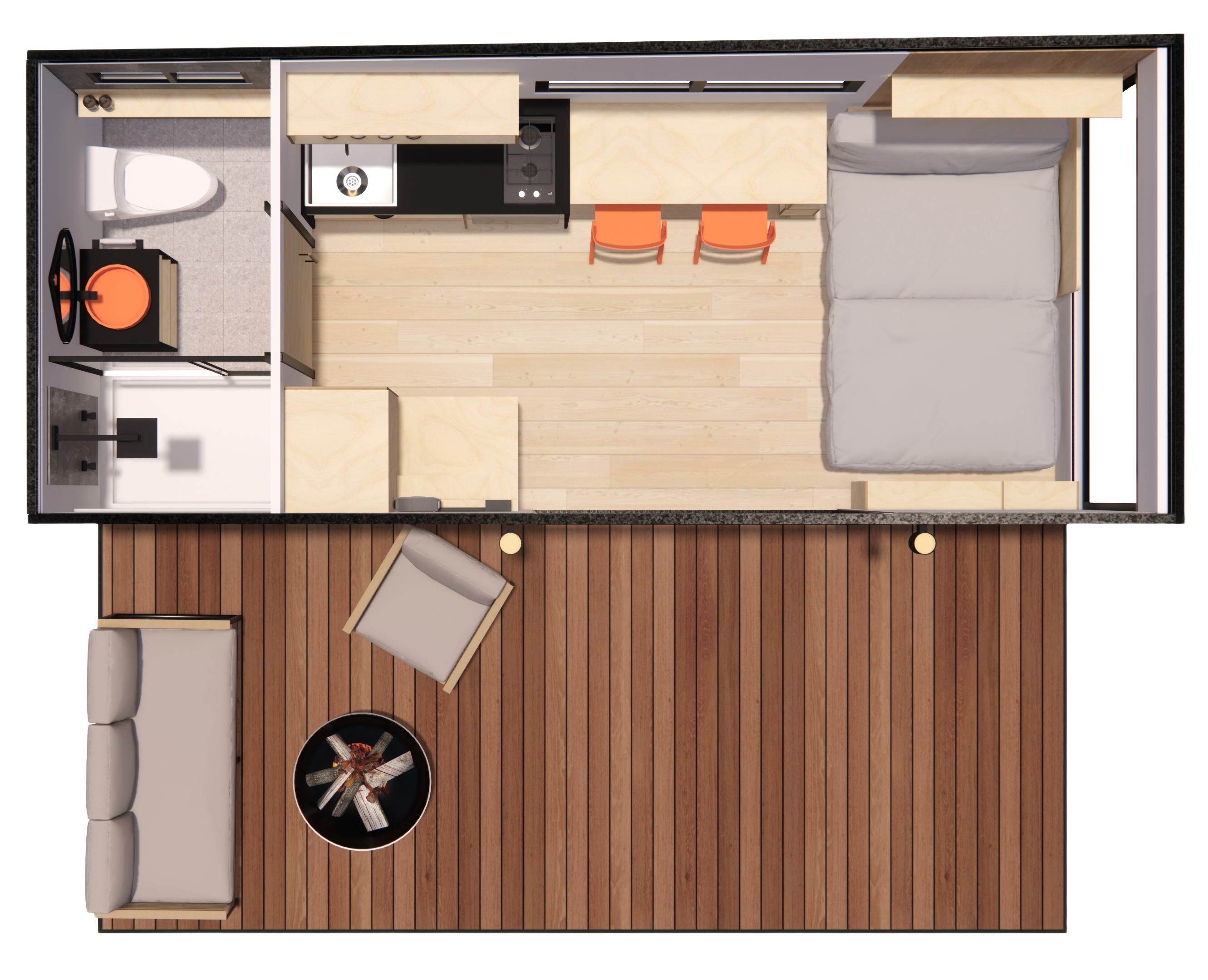 Versión funcional con habitación y baño privado, ideal para glamping o habitación auxiliar.